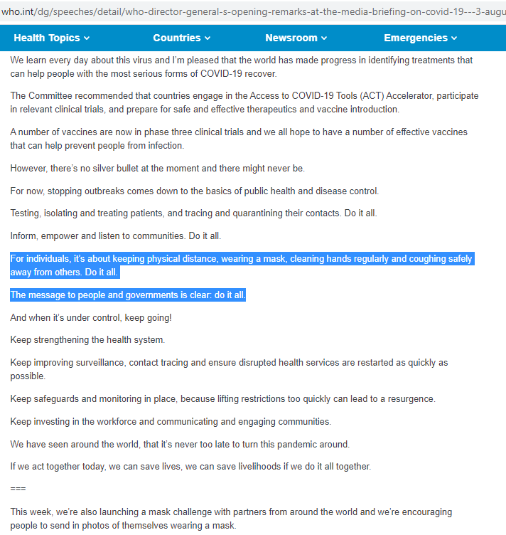 - WHO के हाल में जारी किए गए अपडेट्स को देखें तो इनमें सभी को मास्क पहनने की सलाह दी जा रही है। उदाहरण के तौर पर 3 अगस्त, 2020 को WHO के महानिदेशक द्वारा जारी इस बयान में सभी को मास्क पहनने की चेतावनी दी गई है।