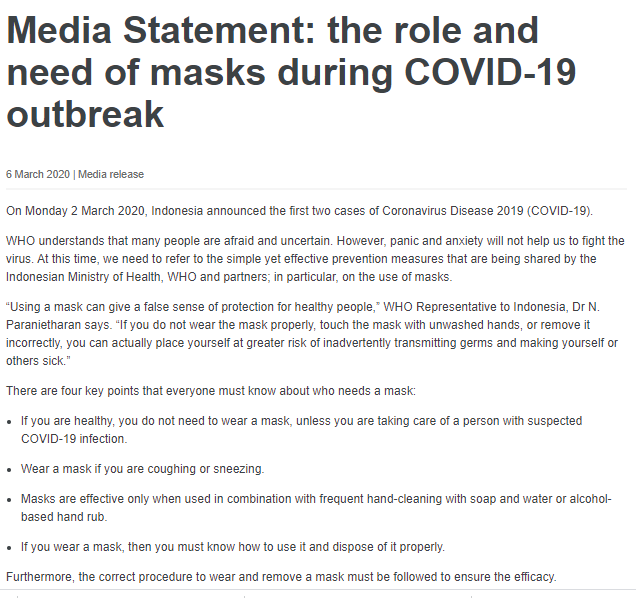 - मार्च में संक्रमण की स्थिति गंभीर नहीं थी। यही वजह है कि WHO ने 6 मार्च, 2020 को जारी किए एक बयान में कहा था कि स्वस्थ लोगों के लिए मास्क पहनना अनिवार्य नहीं है।